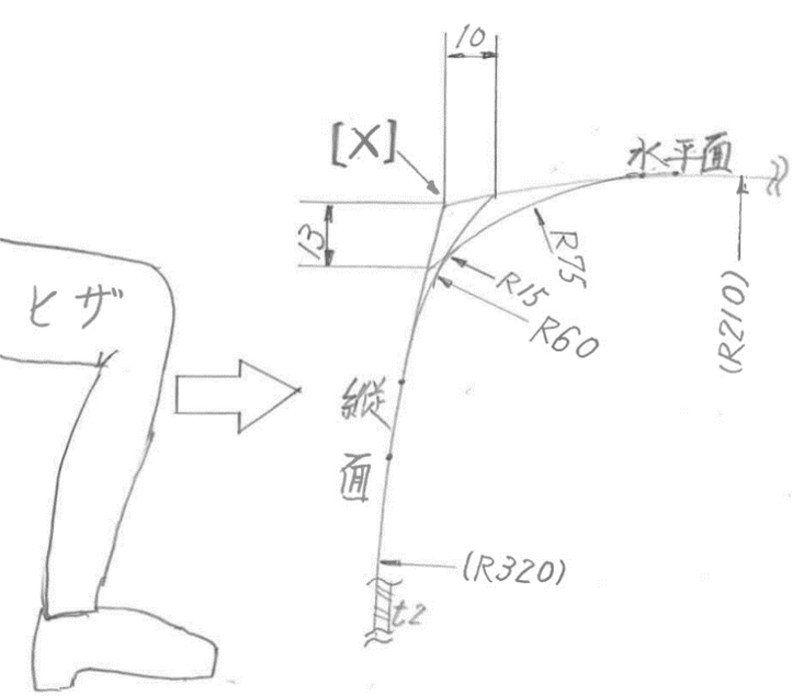 担当デザイナーに見せ形状の理由を説明すると、彼は鉛筆で縦面(R320の曲面)にR60を接して描き、水平面(R210)R75を接して描き、その交点に更にR15を掛けた。それって樹脂金型屋さんにはとてつもなく手間が掛かる。